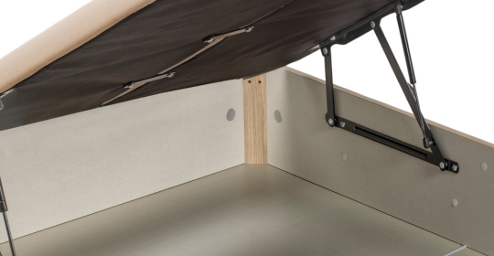 Su sistema de apertura frontal es fácil, cómoda y práctica. Podrás acceder al interior de la cubeta desde cualquier ángulo. Se diferencia por su ausencia de ruidos en funcionamiento. Cuando el canapé no tiene el colchón encima, la tapa puede levantarse sola por la fuerza de los pistones.