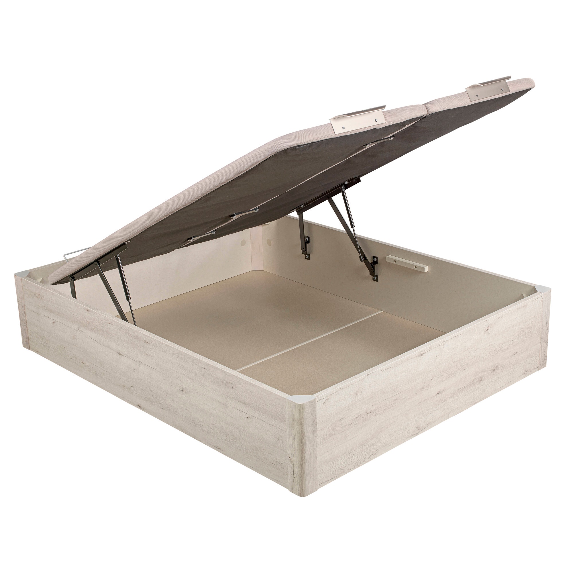 - Tecnología de la tapa: estructura metálica de acero de gran resistencia reforzada con 5 travesaños transversales, tecnología Base Air System (B.A.S.), tirador de aluminio anodizado, arquillo sujeta colchón de acero en el cabecero y sistema fácil de apertura frontal