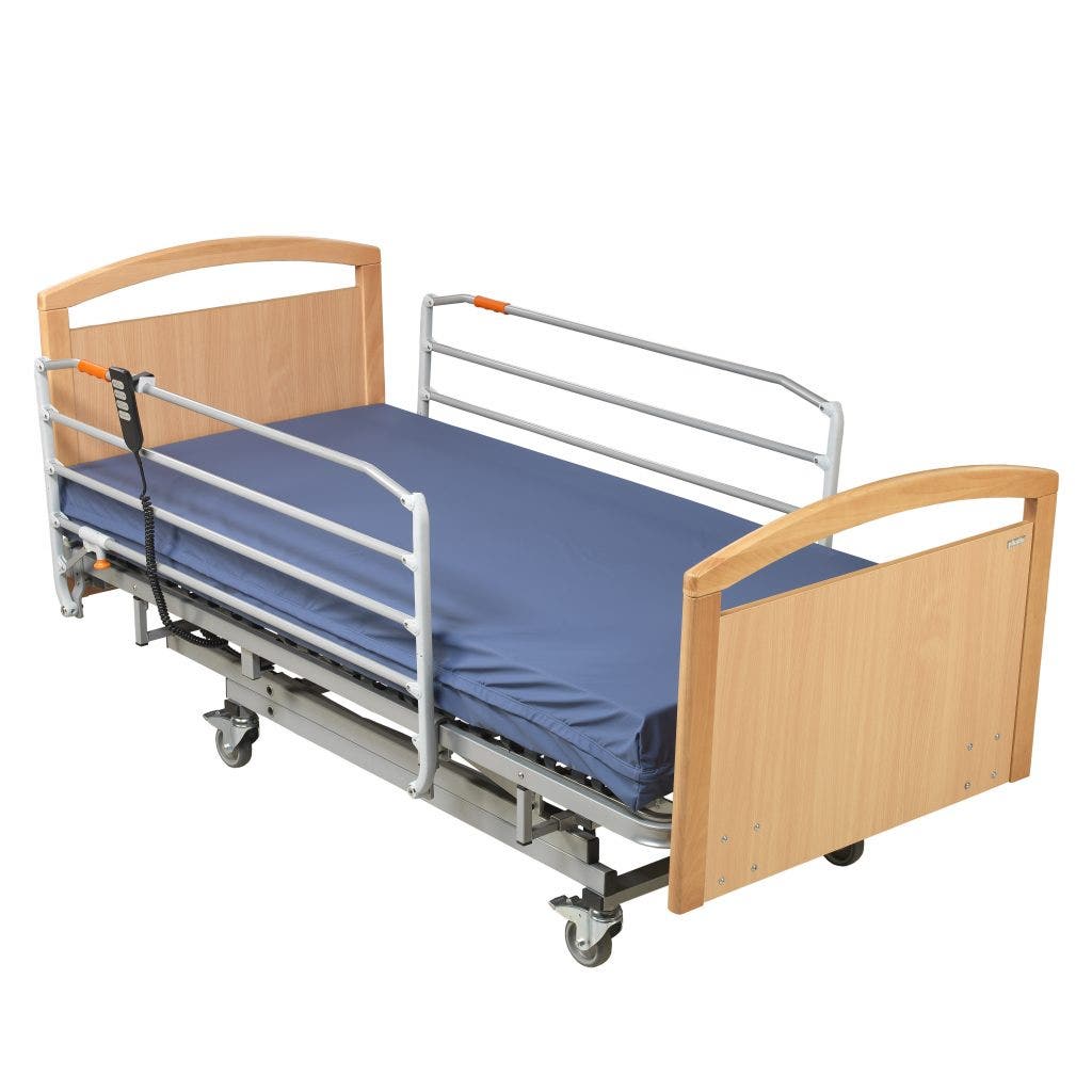 La cama articulada geriátrica Regnet ofrece una solución completa para el descanso de personas mayores. Con una base articulada que incluye colchón viscoelástico, juego de cabecero-piecero y dos barandillas, garantiza comodidad y seguridad. Sus cuatro planos de movimiento eléctrico, junto con patas regulables, aseguran una posición óptima. El colchón bicapa, con espuma HR y viscoelástica, está protegido por una funda bielástica impermeable, antibacteriana y antifúngica, con cremallera de fácil acceso y protección adicional. Con cabecero y piecero atornillados y barandillas con sistema de bloqueo, es una opción recomendada para usuarios de hasta 140 kg.