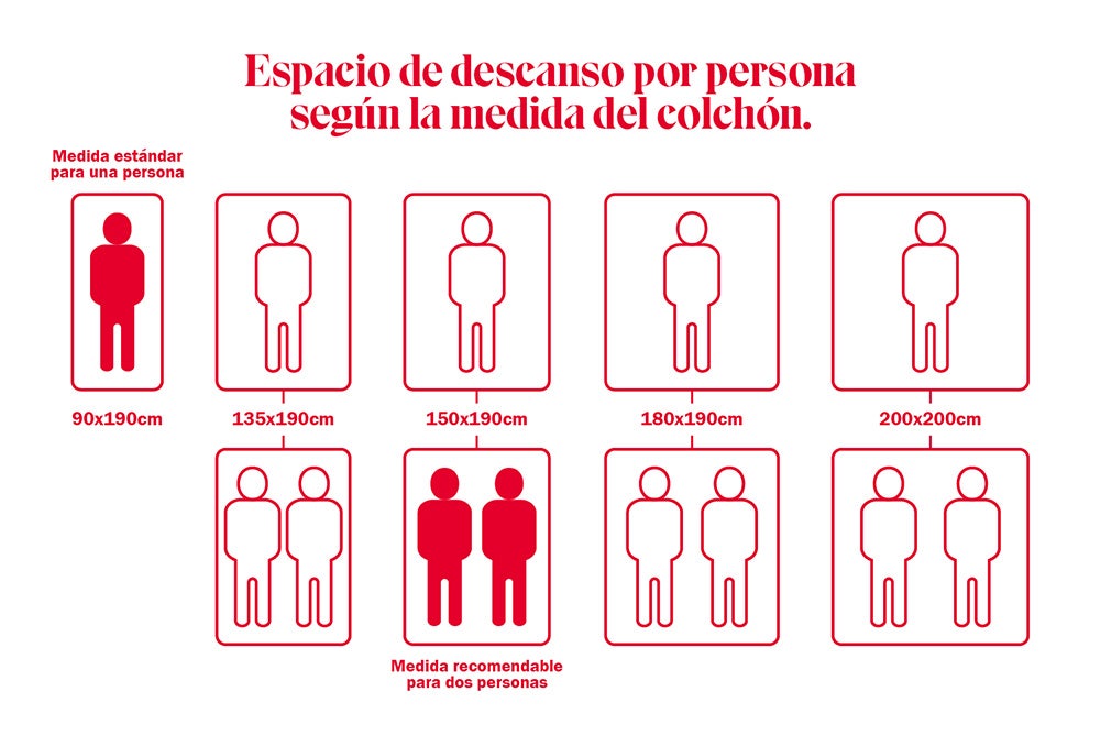 En función de la comodidad y el espacio que queráis tener entre vosotros, tendréis que elegir una medida u otra de colchón. A partir de 150×190, se considera que es una medida adecuada para dormir sin interferir en el sueño del otro.
