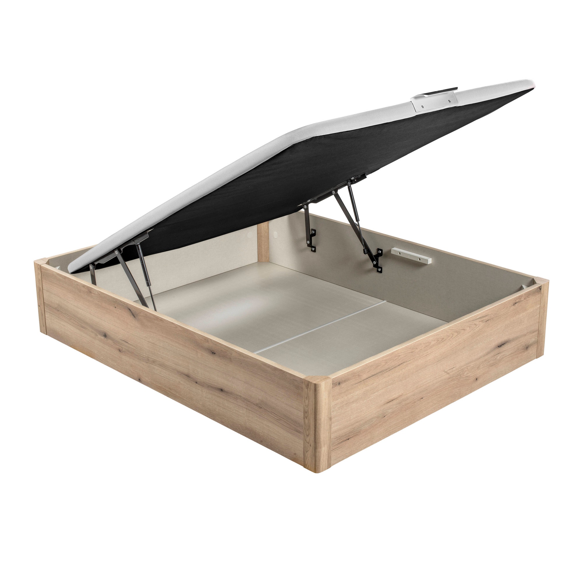 O sistema de abertura frontal é simples, conveniente e prático. Poderá aceder ao interior da caixa de arrumação a partir de qualquer ângulo. Destaca-se pela ausência de ruídos durante a utilização. Se não houver colchão em cima do sommier, a tampa pode ser levantada pela força dos pistões.