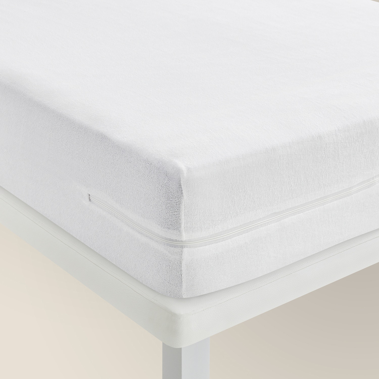 A nossa capa de colchão em felpo de algodão protege o colchão nos 6 lados e adapta-se a colchões até 30 cm de altura graças à sua construção em tecido elástico. É muito macio e completamente respirável, e tem um fecho fácil e perfeito graças ao seu fecho em U.
